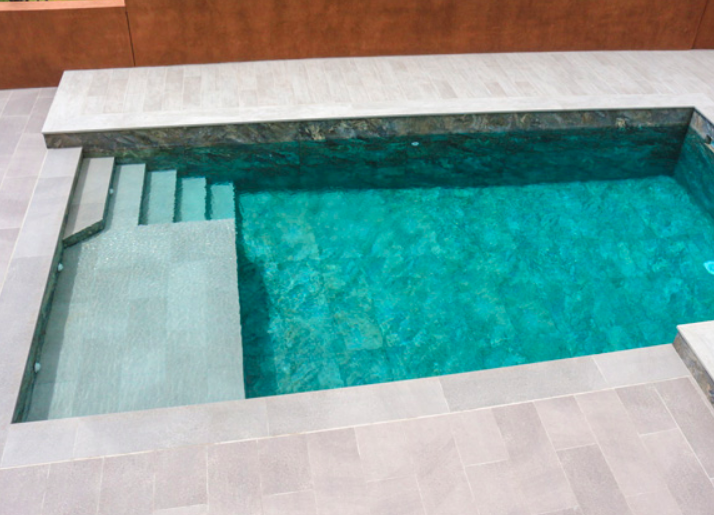 Una vez más tenemos un claro ejemplo de las soluciones que Cerámica Mayor presenta para vaso de la piscina, donde se utiliza la serie Stromboli Silver para el borde, escaleras y banco de sol. Esta serie se utiliza de manera inteligente para fusionar el entorno de la piscina y revestimiento del vaso realizado con Sea Rock Gris Oscuro, que genera multitud atípicos y elegantes tonos de azul. Como coronación y cambio de desnivel de la parcela se utiliza Rainforest blanco que da el punto de luz al conjunto.