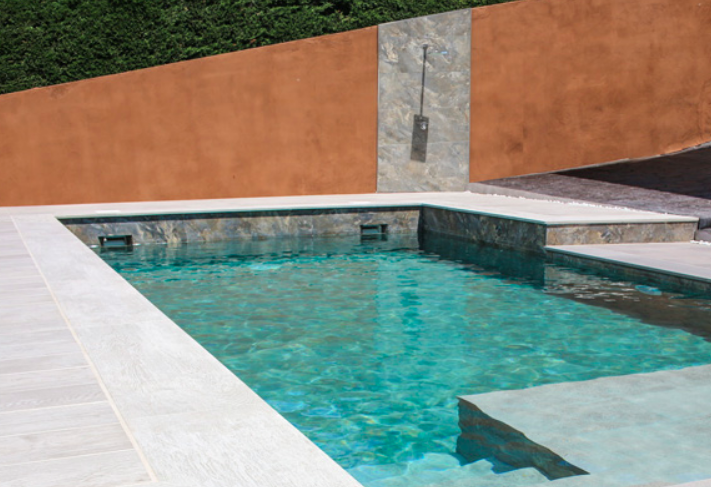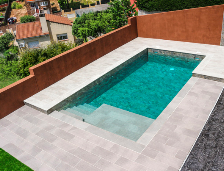 e un revestimiento del vaso 100% de la misma serie, lo que quiere decir, que el interior del vaso quedará de un color totalmente uniforme y natural. La marca cuenta con soluciones para desniveles, bancos de sol o jacuzzi y con la última aportación un sistema de piezas para limpiafondos que facilitan la limpieza del interior del vaso, el sistema conocido como «Media Caña».
